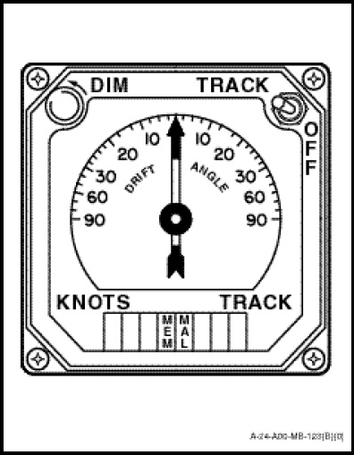 The indicator (Figure 1-11-2) has an inner non-linear fixed scale graduated from 0 to 90 degrees port and starboard indicating the helicopter drift angle. There are two digital displays located on the bottom part of the indicator. The right hand display indicates the true track of the aircraft from 0 to 360 degrees unless the groundspeed is less than 10 knots. The left hand display indicates groundspeeds of 0 to 199 knots. Negative groundspeeds are indicated as speeds decreasing from 200 knots.