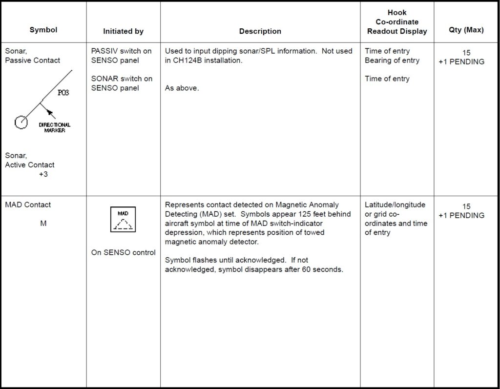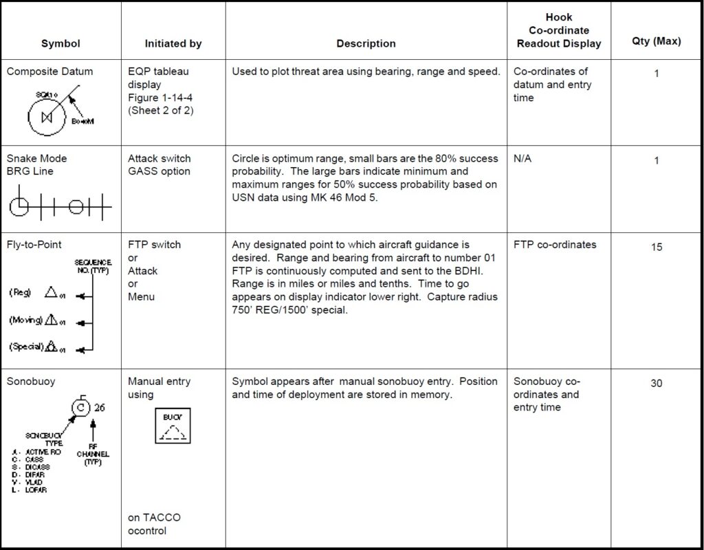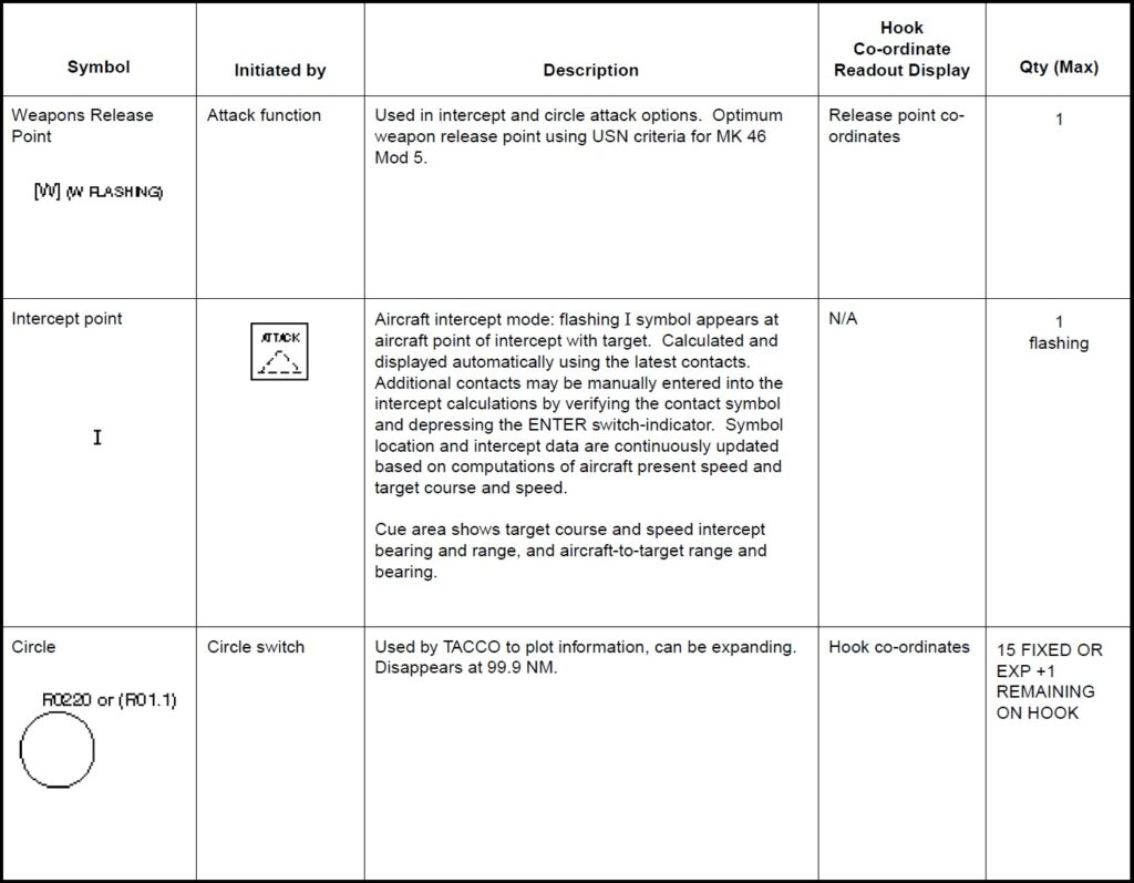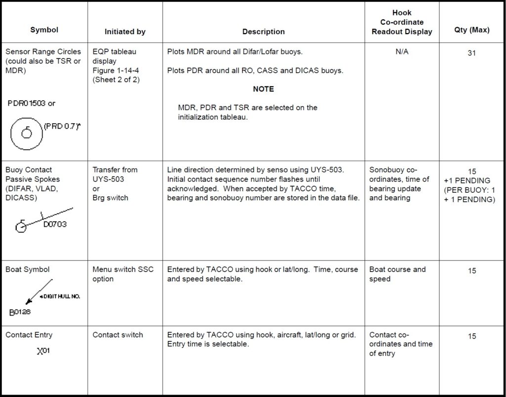 a. Working. Aircraft, base ship, hook, datum, fly-to points, boats, circles and cursors. b. Sonobuoy. ACTIVE (RO), CASS, DICASS, DIFAR, VLAD and LOFAR. c. Contact. MAD, RADAR, ESM, DIFAR and VLAD bearing, DICASS contact and sonobuoy range circles. d. Attack. Position, weapon release point, recommended range-to-target and intercept.