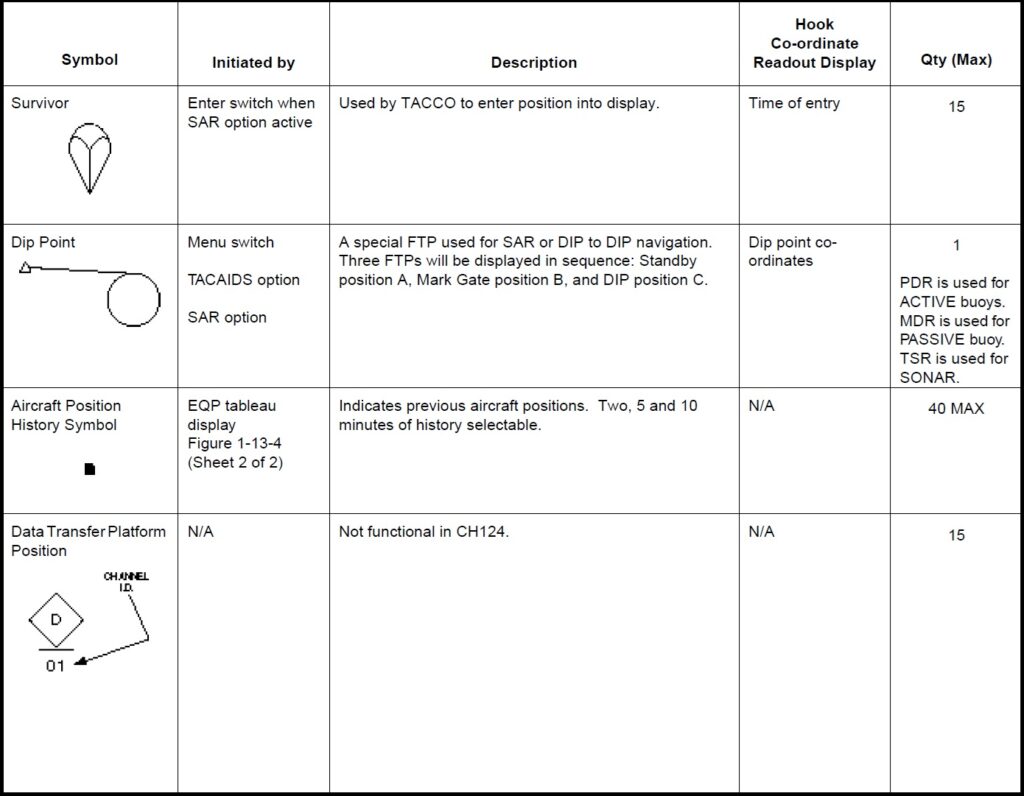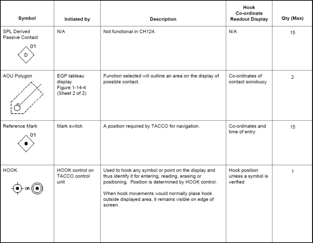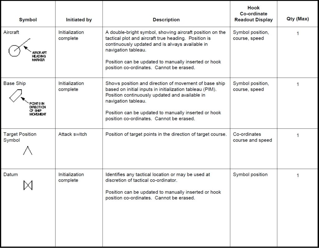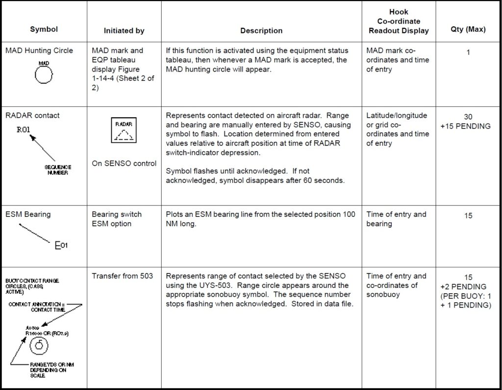 a. Working. Aircraft, base ship, hook, datum, fly-to points, boats, circles and cursors. b. Sonobuoy. ACTIVE (RO), CASS, DICASS, DIFAR, VLAD and LOFAR. c. Contact. MAD, RADAR, ESM, DIFAR and VLAD bearing, DICASS contact and sonobuoy range circles. d. Attack. Position, weapon release point, recommended range-to-target and intercept.